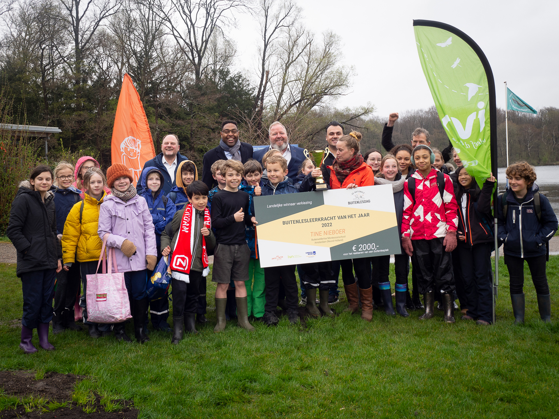 Juf Tine van de Buitenveldertse Montessorischool in Amsterdam is verkozen tot eerste ‘Buitenlesleerkracht van het jaar’. De juf van groep 7 werd eerder al winnaar in de provincie Noord-Holland. Een vakjury en kinderjury bepaalden later dat Tine Nieboer, die wekelijks met haar groep naar het Amsterdamse Bos gaat, een jaar lang de titel van beste buitenjuf van Nederland mag dragen. De bijbehorende bokaal en het geldbedrag van €2000,- voor de aanleg van een buitenlesplek, heeft Tine op Nationale Buitenlesdag op dinsdag 5 april uitgereikt gekregen.