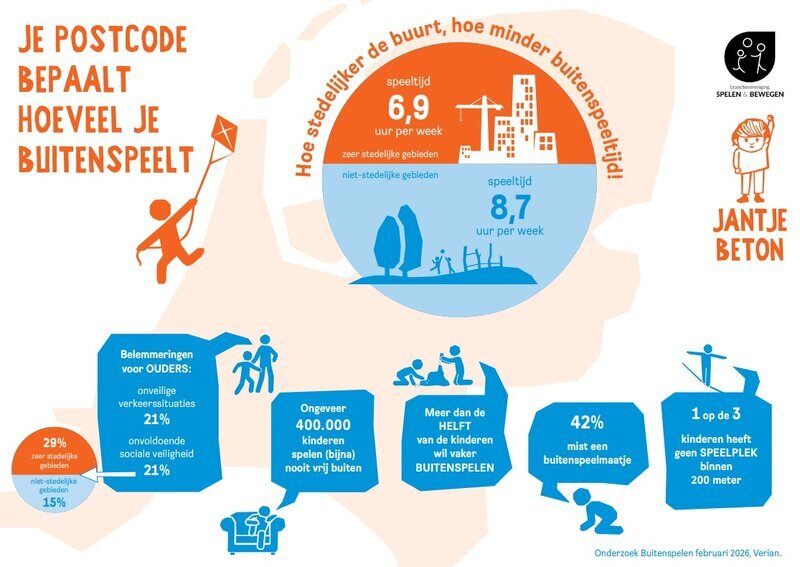 Jantje Beton zet zich al jaren in voor meer en uitdagendere speelruimte en volgt daarom het buitenspeelgedrag van kinderen om gericht actie te kunnen ondernemen. Het nieuwe Onderzoek Buitenspelen 2026 laat zien dat kinderen in Nederland minder buitenspelen dan een paar jaar geleden. Bovendien heeft niet elk kind dezelfde kansen om buitenspelen dagelijks vanzelfsprekend te maken. Waar je woont, maakt verschil.