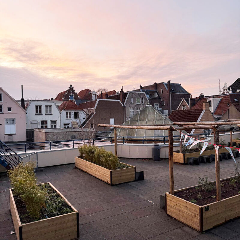 Laura, leerkracht groep 6: onze school is uniek gelegen midden in het centrum van Deventer, op het dak van een winkelcentrum. Dit brengt specifieke uitdagingen met zich mee, met name voor ons schoolplein. De mogelijkheden waren beperkt: een zandbak was te zwaar en schommels mochten niet worden geplaatst vanwege boorrestricties. We hebben daarom gekozen voor vergroening zonder tegels te verwijderen.