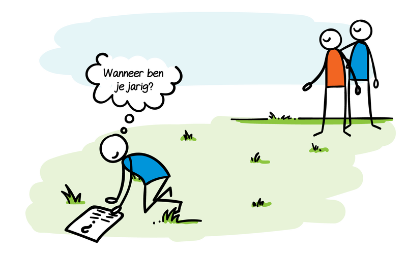Voorbereiding: Leg het lijstje met vragen en een pen op de grond, bijvoorbeeld op de stoep of in het gras. Maak vervolgens een startlijn een stukje verderop.
