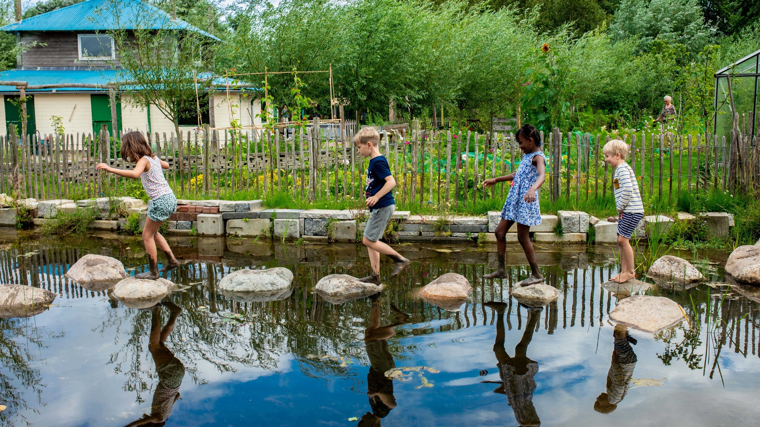 Veilig en avontuurlijk: Een natuurlijke speelplek met verschillende speelaanleidingen, schaduw, water en ruimte om te ontdekken. Het hele jaar door.